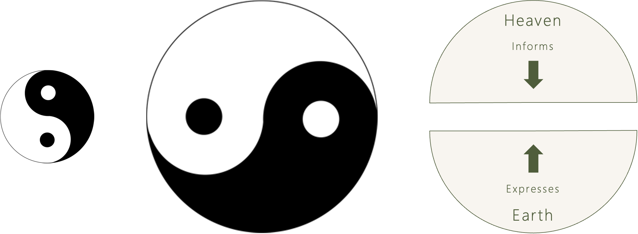 Seemingly opposite forces: Heaven (tian) and earth (di) operate as cosmic counterparts, with human beings standing in between them as mediator.
